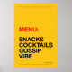 Erhellen Sie Ihre Küche mit Humor! “MENÜ: SNACKS, COCKTAILS, KLATSCH & STIMMUNG” Poster in moderner Typografie. Verfügbar in mehreren Hintergrundfarben, perfekt als Heimdekoration, Geschenke oder Küchenwandkunst.