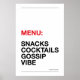 Erhellen Sie Ihre Küche mit Humor! “MENÜ: SNACKS, COCKTAILS, KLATSCH & STIMMUNG” Poster in moderner Typografie. Verfügbar in mehreren Hintergrundfarben, perfekt als Heimdekoration, Geschenke oder Küchenwandkunst.