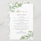 Eine individuell gestaltete Speisekarte mit Aquarell und weißen Blume. Diese Aquarellkarte ist perfekt für jedes Hochzeitsthema und jede Jahreszeit. Personalisieren Sie diese, indem Sie Namen, Datum und Menüdetails hinzufügen.