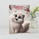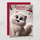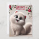 Eine weiche, winterliche Szene mit einer weißen, flauschigen Katze mit großen, ausdrucksstarken Augen. Der Satz "Meowy Christmas" ist in einem festlichen, skurrilen Schriftart geschrieben.