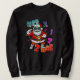 This sweatshirt design features a fun and vibrant Christmas theme. At the center, there is a cool, modern Santa Claus wearing sunglasses, sneakers, and a red outfit with colorful geometric patterns. Santa is striking a confident, dancing pose with one fist up and the other bent at his waist.
