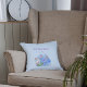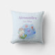 Ein individualisierbarer Kinderzimmer-Kissen in blauem Design mit einer Unterwasserdarstellung einer Meerjungkatze (Meerjungkatze) mit Fischen, Quallen, Seepferd. Sie können sowohl den Namen als auch das Datum anpassen.