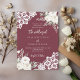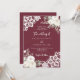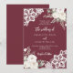 Für eine elegante und romantische Hochzeit. Ein zauberhafter, bordeauxfarbener Hintergrund mit weißen Blumen, Rose und weißen Spitzen. Personalisieren Sie Ihre Namen und Details und fügen Sie diese hinzu.