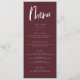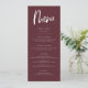 Moderne minimalistische Hochzeitsmenü-Karte mit boho Script-Schriftart. Die Hintergrundfarbe ist in Merlot rot mit weißen Texten.