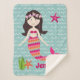 Dieser hübsche Meerjungfrau-Werfer verfügt über eine brünette Meerjungfrau mit mehrfarbigen gestreiften Schwänzen aus Muschel in Orange, Fuchsia, Hellrosa und Aqua. Sie trägt ein dunkelrosa Bikini-Oberteil und hat ein rosa Blumenkopfband. Sie schwimmt in einem Meer von aquablau-weißen Wellen, mit rosa-orangefarbenen Seestern und Meeresalgen Akzenten. Der Sherpa-Wurf ist auch mit einem Namen personalisiert, der entfernt oder geändert werden kann, um zu sagen, was immer Sie gewollt haben.