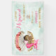 Schlafende Baby Meerjungfrau in einer goldenen Muschel, umgeben von Perlen. Rosa Schwanz Fin und Gold & rosa Tiara. Banner auf Muschel lautet "Wertvoll". Minzer Hintergrund.