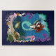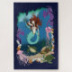 Eine Meerjungfrau ist unter Seepferden, Sternfischen, Schildkröten, Quallen und Schätzen in blauer Umgebung