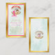 Schlafende Baby Meerjungfrau in einer goldenen Muschel, umgeben von Perlen. Rosa Schwanz Fin und Gold & rosa Tiara. Banner auf Muschel lautet "Wertvoll". Minzer Hintergrund.
