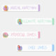Personalisierte Namensschilder - perfekt für Schulbedarf für Kinder und Schüler jeden Alters. Niedliches Meerjungfrau-Design und pastellfarbene Farbpalette von rosa lila grün und blau. Sie können bis zu 4 verschiedene Namen in handgeschriebener Typografie verwenden. Wenn Sie gewollt haben, den Schriftart, die Farbe oder die Größe zu ändern, klicken Sie auf, um weitere Anpassungen vorzunehmen und mit dem Entwurfstool zu bearbeiten.