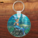 Meerjungfrau sitzt auf einem Felsen unter Wasser.