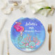 Das ist eine hübsche Geburtstagsfeierplatte aus Meerjungfrau und Perlmuschel, die mit ihrem Geburtstagsmädchen und ihren Freunden ein Hit sein wird. Die Illustration ist auffallend in hellen Farben in Rosa und Blau. Personalisieren Sie die Teller, indem Sie den Namen, das Alter und die Nachricht ändern.