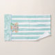 Pretty watercolor mermaid with orange octopus hair, a green tail, dressed in shells, and holding a sea turtle. All on a sea of sea foam blue stripes and faux marble waves.