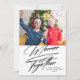Wünschen Sie Ihren Freunden und Ihrer Familie ein frohes Weihnachtsfest mit dieser modernen, einfachen Weihnachtskarte für das Foto. Das Design beinhaltet das Kalligrafieschrift ''merrier together'' in trendiger handgeschriebener Schrift, Single Foto und Nachricht. Ideal für Paare, Jungvermählte usw.