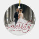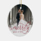 Elegantes Urlaubssornament für Neuvermählte mit einem beliebten Hochzeitszitat auf beiden Seiten, mit "Merrily Ever After" überlagert in schicker Kalligraphie-Schrift. Personalisieren Sie mit Ihren Namen und Hochzeitsdatum auf der Rückseite.