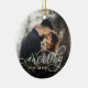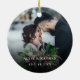 Elegantes Urlaubssornament für Neuvermählte mit einem beliebten Hochzeitszitat auf beiden Seiten, mit "Merrily Ever After" überlagert in weißer Kalligraphie-Schrift. Personalisieren Sie mit Ihren Namen und Hochzeitsdatum auf der Rückseite.