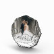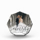 Ein elegant gestalteter, urlaubsszenierter Sake für Neuvermählte, der mit einem beliebten Hochzeitsszenario-Foto mit "Merrily Ever After" überlagert ist.