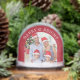 A red Christmas snow globe keepsake featuring two arch photos and Merry & Bright in elegant white serif lettering.