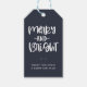 Feierliche Merry and Bright, Feiertage Geschenkmarken. Design-Features, skurrile weiße Feiertagstypografie zitieren auf marineblau Hintergrund. Template-Textzeile für Ihre Nachricht.