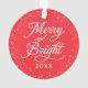 Das schlichte und moderne Weihnachtsdekor im Foto zeichnet sich durch ein rundes Bild aus, das durch ein Muster aus bunten Lichtern und Sternen gerahmt ist. Auf der Rückseite des Ornaments befindet sich "Merry and Bright" in elegantem Schriftzeichen mit individuellem Text für das Jahr. Die festlich hellrote Hintergrundfarbe kann geändert werden.