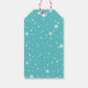 Festival "Merry & Bright" themed Christmas gift tag cards feature a two-sided custom design with border of white stars and snowflakes that you can personalize. The teal / turquoise blue background color can be customized.