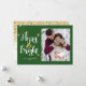 Eine schöne Fotokarte mit winzigen Punkten, die ein Glitzer-Look-Muster bilden, und "Merry & Bright" in einem wunderschönen handgezeichneten Skript-Schriftart, die Ampere und in einer goldenen Textur verziert. Fügen Sie einfach Ihr eigenes Foto hinzu und passen Sie den Namen und das Jahr auf der Vorderseite der Karte an! Es gibt einen grünen Rahmen, der das Foto umgibt, sodass jedes Bild, das Sie darin einsetzen, gerahmt ist. Die Rückseite der Karte ist mit schönen goldenen Folienteilen gefüllt.