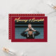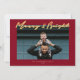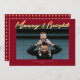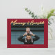 Merry & Bright, goldgelbe Neonschilder, Familienurlaub-Karte mit Foto. Festige rote Hintergrundfarbe und Neonsternmuster als Hintergrund.