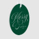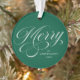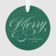 Elegantes Weihnachtsschmuck mit "Merry" auf der Vorderseite in einem weißen Kalligrafiebuffer mit grünem Hintergrund. Personalisieren Sie die Vorderseite des Ornaments, indem Sie Ihren Namen und das Jahr in weißer Schrift hinzufügen. Auf der Rückseite des Ornaments wird Ihr Foto angezeigt.