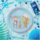 Chris-Moose ist mit einem rot-weiß gestreiften Schal und einer Weihnachtsmannmütze in seiner Feinheit gekleidet. Seine Geweihe sind mit Weihnachtsliedern, Strümpfen und Ziergegenständen geschmückt. Neben ihm ist ein Stapel verpackter Weihnachtsgeschenke. Ein roter Vogel mit einer Weihnachtsmannmütze sitzt in einem Baum neben seinem Vogelhaus. Ein Weihnachtsbaum hängt mit einem bereits darin enthaltenen Geschenk vom Strumpf. Typografie sagt "Oh so fröhlich". Der Hintergrund ist blau mit funkelnden und funkelnden Sternen überall. Das wären wunderschöne Teller für Weihnachten, die mit Freunden und Familie zusammenkommen!