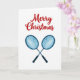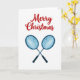 This Christmas card is fun and festive! 🎅🏼🎄🎁 The words “Merry Christmas” are written in bold red letters that really stand out. Below the text, two badminton racquets are crossed, with their strings sparkling like frost. The colors mix red, navy, and icy blue for a cheerful holiday look. The card combines classic Christmas vibes with a sporty twist. It’s perfect for anyone who likes both holiday cheer and fun activities. This card makes spreading joy feel playful and lively.