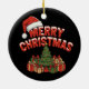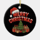 A festive ceramic ornament featuring a bold “Merry Christmas” design, accented with a Santa hat, Christmas tree, and colorful presents. Perfect for adding classic holiday charm to any Christmas tree.