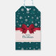 A festive scene unfolds with a gentle snowfall of shimmering snowflakes and twinkling stars against a rich teal background. A crafted red bow, perfectly centered, in the soft light. The words 'Merry Christmas' elegantly appear beneath the bow, enhancing the warm, joyful atmosphere.