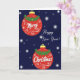 In this card, we see a festive holiday scene with two bright red Christmas ornaments as the centerpiece. The top ornament says "Merry" in elegant white script, while the bottom one completes the greeting with "Christmas." To the right displays Happy New Year! Both ornaments are carefully designed with a golden hanger and a green, stylized laurel wreath embellished with a small amber berry, giving them a classic seasonal charm.