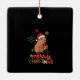 This festive illustration features an adorable capybara, wearing a Santa hat and holding a small gift, with colorful snowflakes surrounding it. At the bottom, a cheerful "MERRY CHRISTMAS" greeting is displayed in decorative lettering, creating a lovable holiday-themed design against a contrasting black background.