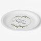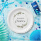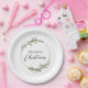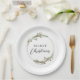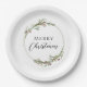 Paper plates featuring a minimalist watercolor wreath with red floral and green foliage accents. This elegant wreath frames the greeting "Merry Christmas".