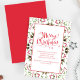 This design features a merry Christmas whimsical party cute party invitation with a stylish trendy calligraphy script font, red and green typography lettering, pinecones greenery foliage leaves leaf, with botanical simple holly berry berries, a simple minimalist design pattern minimal, creative simplistic unique whimsy, stylish creative elegance elegant fun, classic fancy filigree swirly swirl, cute simple holiday party invite