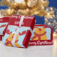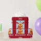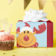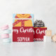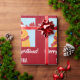 Moderne Weihnachtsgeschenkverpackung für Kinder, mit Rudolph dem Rentier, dem Gruß "Frohe Weihnachten" in stilvoller Typografie und einem personalisierten Namen. Auf einem Weihnachtsrot.