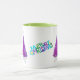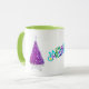 This coffee or tea mug has two sparkle like dark pink Christmas trees decorated with shiny silver stars sitting on star shaped rugs with the text Merry Christmas in bold fancy letters with yellow stars.