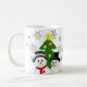 Personalisieren Sie diese Liebling Schneemann und Weihnachtsbaumkaffee Tasse mit Ihrem Namen und Feiertagsgruß. Diese Tasse bietet auch Silberschneeflocken.