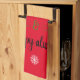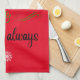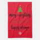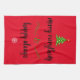 Festliches Küchentuch mit einer Abbildung eines grünen Weihnachtsbaumes mit einem gelben Stern auf der Oberseite, einer Schneeflocke und den Worten: "Merry alles & Happy immer" in schwarz, auf rotem Hintergrund.