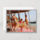 Eine Strandpostkarte eines klassischen, altmodischen Märchens, das sich am Strand von Brighton, East Sussex, England, erfreut. Die farbenfrohen Pferde am Kreisverkehr sind gut aussehend in ihrer farbenfrohen, goldenen, grünen und lila Liege, mit ihren silbernen Pfählen, die zu den Lichtern des Baldachins reichen. Der Strand und der Brighton Pier liegen im Hintergrund.