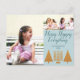 Eine 3 Foto Collage Urlaub Postkarte Vorlage für Sie zu personalisieren für elegante Gold und blau interreligiösen Merry Happy Alles Urlaub Grüße. An der Vorderseite dieser schicken Imitate mit goldfarbenen und pastellblauen Foto-Postkarten stehen moderne Weihnachtsbäume und eine goldene Menorah sowie zwei kleine und eine große Bildvorlage, die es Ihnen leicht machen, Ihre Fotos in das Design einzufügen. Alle Texte können personalisiert sein, von MERRY HAPPY ALLES in einem tiefblauen whimsical handgeschriebenen Skript bis zum Platz für Ihren Namen und das Jahr auf der Vorderseite, das genauso einfach zu personalisieren ist. Diese Foto Collage Postkarten rückwärts zu offenbaren eine Grenze von tiefblau, den goldenen Ton Weihnachtsbaum und Hanukkah Menorah Design auf der Unterseite und optional gedruckte Text für Ihren Urlaub Gruß.
