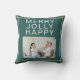 Frohe Jolly Happy Custom Family Foto Grün Weihnachtskissen. Glücklicher, fröhlicher Text in einer modernen weißen Typografie auf dunkelgrünem Hintergrund. Fügen Sie Ihr Foto, Familienname und Jahr hinzu. Personalisierter Familienurlaub.