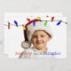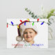 Freuen Sie sich auf eine bunte Weihnachtsgrüßkarte im flachen Stil, mit Ihrem individuellen Foto, auf der Vorderseite, mit farbenfrohen Weihnachtsbeleuchtung. Merry und Bright in rot, grün und blau gemacht, schmückt den vorderen Boden der Karte. Die Rückseite ist weiß mit den gleichen bunten Weihnachtslichtern über dem oberen und benutzerdefinierten Text, der bereit ist zu personalisieren.