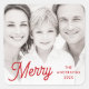 Christmas photo stickers featuring your custom family photo and red text “Merry” in a festive, retro style font with customizable name and year to the right.