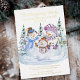 Luxuriöse Foil Weihnachtskarte von Ihrer neuen Zuhause. Der Wortlaut lautet: "Die ... Familie hat eine neue Zuhause für die Ferien", gefolgt von Ihrem personalisierten Weihnachtsgrüßen und Ihrer neuen Adresse. Dieses Aquarelldesign besticht durch 3 niedliche Schneemänner mit einem Hintergrund von Weihnachtsbäumen.