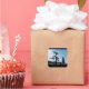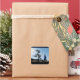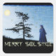 Weibliche Figur in gedeckter Mandel auf einem Hügel mit Vollmond, goldenen Sternen und einem einsamen Winter immergrün. Die Worte wünschen Ihnen einen "Frohen Frieden".