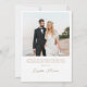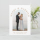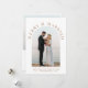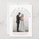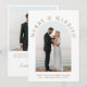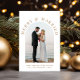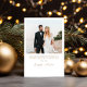 Elegante weiße Hochzeitsankündigung und Weihnachtskarte für Neuvermählte mit Ihrem Foto in einem Bogenrahmen, "Merry & Verheiratet" in klassischer Goldserfintypografie, und Ihrem saisonalen Gruß, Namen und das Jahr in schlichter moderner Goldtypografie. Fügen Sie ein zusätzliches Foto auf der Rückseite, Ihre personalisierte Nachricht an Familie und Freunde, und Ihre Vornamen in einem signaturähnlichen Goldskript.