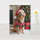 This charming card features a Golden Retriever wearing a red and green Christmas sweater adorned with white holiday bells and a classic Santa hat. The dog's golden fur shines in the soft light, matching its festive outfit. Its expression radiates joy and friendliness, with a slight smile and bright eyes looking directly at you.