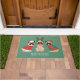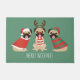Niedliche Abbildung von drei Mops-Hunden in Weihnachtsbekleidung.