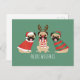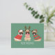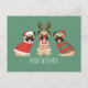 Niedliche Abbildung von drei Mops-Hunden in Weihnachtsbekleidung.